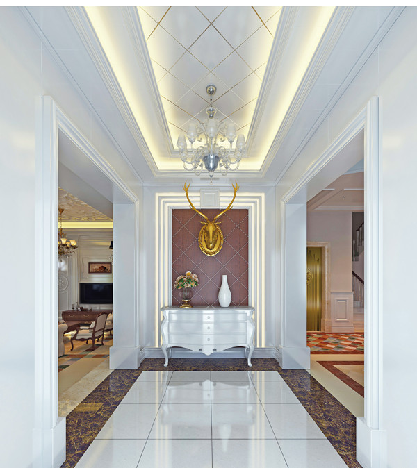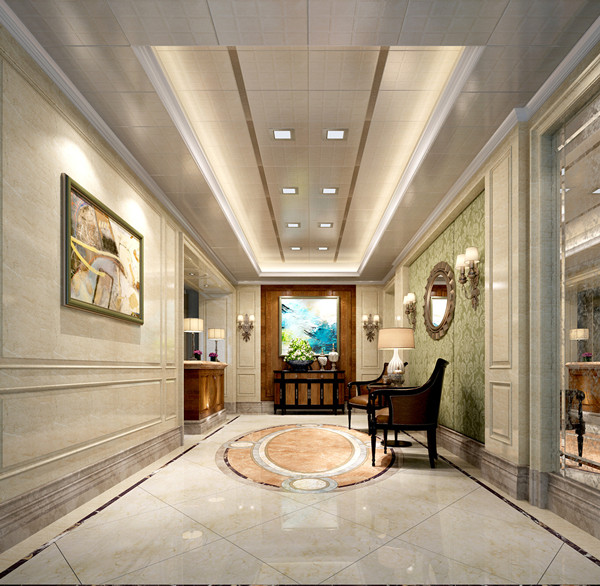 明亮的光線可以讓空間變得寬敞,也可以緩解狹長過道所產(chǎn)生的緊張感。過道常用多個筒燈、射燈、壁燈營造光環(huán)境。通過光線效果,增強過道的空間感,并且與客廳及其他空間區(qū)域相協(xié)調(diào)。